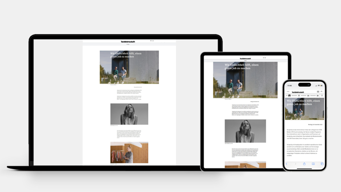 Mit den Display- und Native-Ad Formaten auf TextilWirtschaft.de nutzen Sie die visuelle Anziehungskraft der digitalen Medien voll aus. Transportieren Sie Ihre individuellen Botschaften und Emotionen und stärken Sie Ihr Image als Arbeitgeber in der Branche.