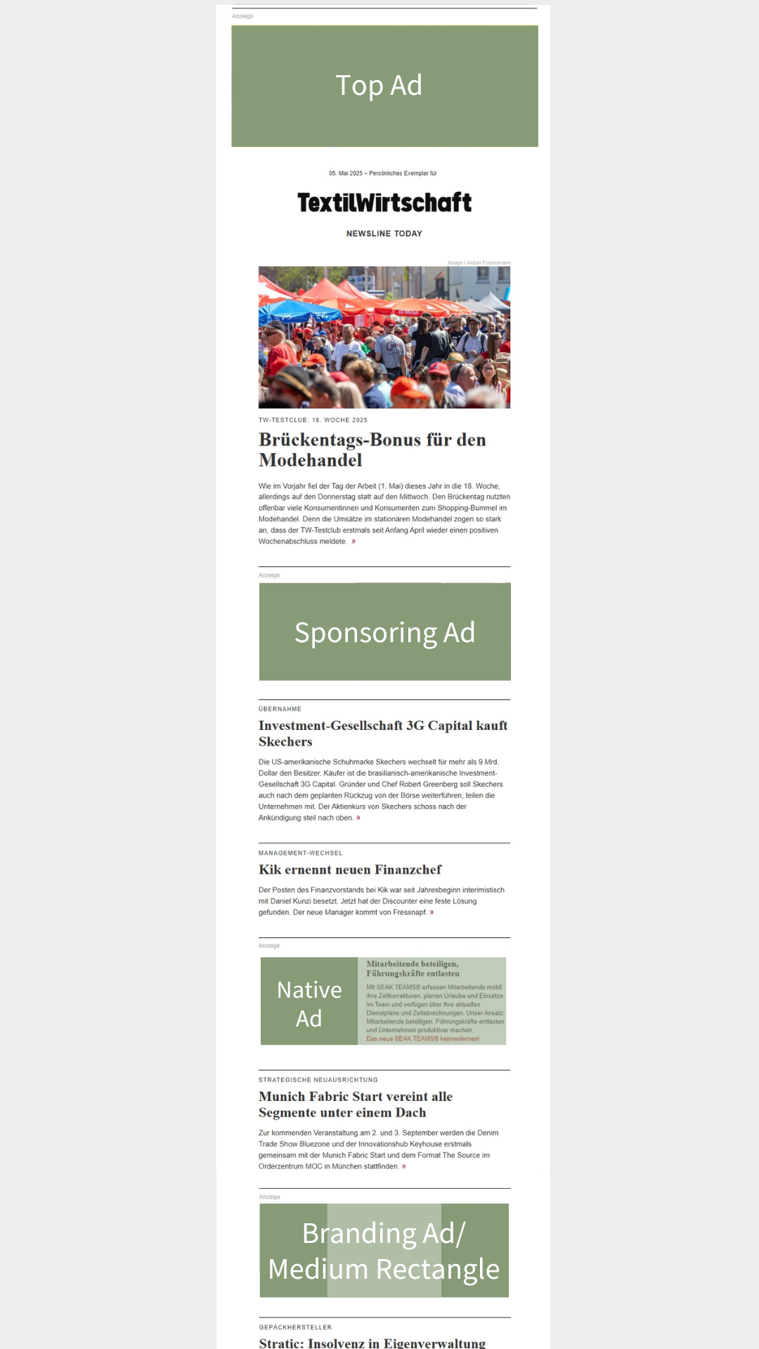 - Deadline Datenanlieferung: Mittwoch der Vorwoche, 10 Uhr an werbemittel@textilwirtschaft.de