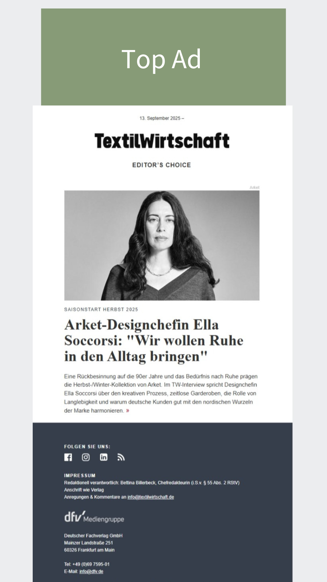 - Deadline Datenanlieferung: Mittwoch der Vorwoche, 10 Uhr an werbemittel@textilwirtschaft.de